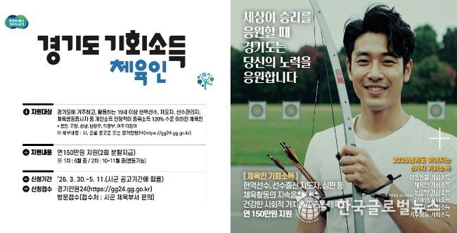 (한국글로벌뉴스 - 박소연 기자) 평택시는 체육인의 안정적인 활동 기반 마련과 지역 체육 발전을 도모하기 위해 추진하는 ‘경기도 체육인 기회소득’지원 사업을 시행하고, 참여 대상자를 3월 30일부터 5월 11일까지 모집한다고 밝혔다.