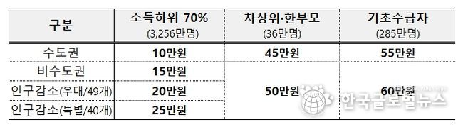 소득 하위 70% 국민에게 거주 지역별로 수도권 10만원, 비수도권 15만원, 인구감소 우대지역 20만원, 인구감소 특별지역 25만원을 지급할 예정이며, 한부모가족・차상위계층은 45만원, 기초생활수급자는 55만원을 지급하되 비수도권에 거주하는 경우에는 1인당 5만원을 추가 지급한다.