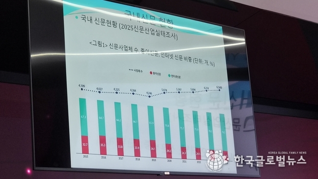 이날 간담회에서는 무엇보다도 현재 언론 환경의 구조적 변화가 주요 화두로 떠올랐다. 발제를 맡은 홍문기 교수(한세대학교)는 국내 신문 산업이 빠르게 디지털 중심으로 재편되고 있음에도 불구하고, 이를 뒷받침할 제도와 기준은 여전히 과거에 머물러 있다고 지적했다.