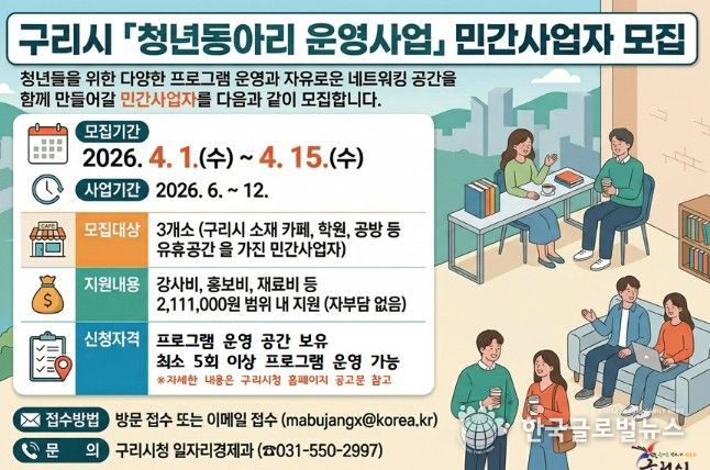 (한국글로벌뉴스 - 박종욱 기자) 구리시는 4월 1일부터 청년들의 자율적이고 창의적인 활동을 지원하기 위한 ‘구리시 청년동아리’를 운영할 민간사업자를 모집한다고 밝혔다.