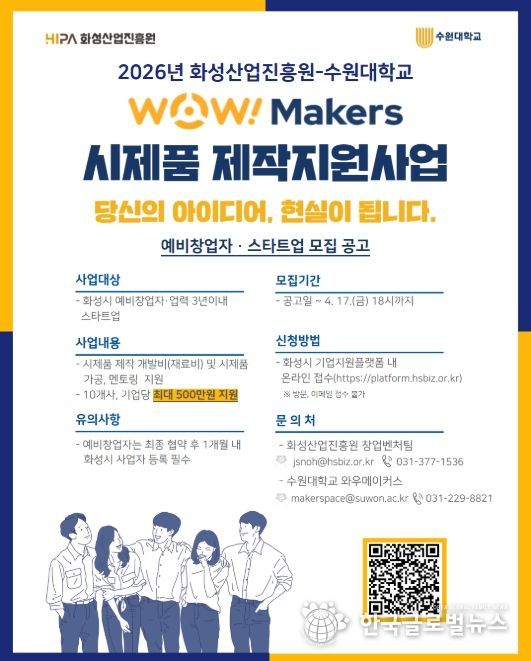 (한국글로벌뉴스 - 박소연 기자) 화성산업진흥원(원장 전병선)과 수원대학교(총장 임경숙)가 협력하여 화성시 창업기업의 아이디어를 실물로 구현하는 ‘2026년 WoW! makers 시제품 제작 지원사업’을 추진한다.