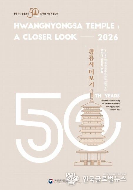 (한국글로벌뉴스 - 박소연 기자) 국가유산청 국립문화유산연구원 국립경주문화유산연구소는 황룡사지 발굴조사 50주년을 맞아 2026년 숭문대 인문학 강좌 '황룡사 더보기'를 오는 4월 8일부터 10월 15일까지 경주 보문단지 내 황룡원에서 개최한다.