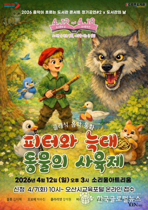 (한국글로벌뉴스 - 박소연 기자) 오산시 소리울도서관은 오는 4월 12일 오후 3시 소리울아트리움에서 ‘2026 도서관의 날’을 기념해 온 가족이 클래식의 매력을 즐길 수 있는 '음악이 흐르는 도서관 콘서트'를 개최한다.