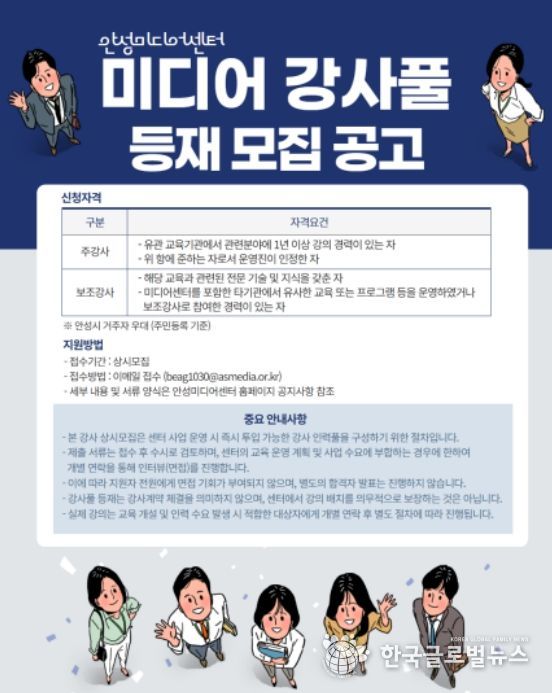 (한국글로벌뉴스 - 박소연 기자) 안성시는 4월 1일부터 보다 체계적이고 전문적인 미디어 교육 운영을 위해 ‘미디어 강사풀’ 등재 강사를 상시 모집한다.
