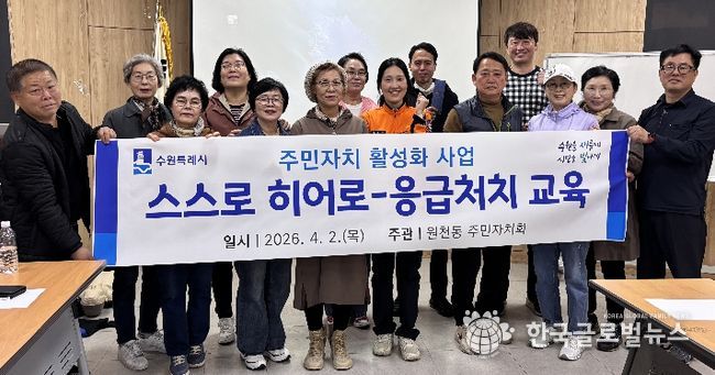 (한국글로벌뉴스 - 박소연 기자) 수원시 영통구 원천동은 지난 2일 원천동 주민자치회가 행정복지센터 소회의실에서 2026년 주민자치회 활성화 사업의 일환으로 응급처치 교육 ‘스스로 히어로’를 실시했다고 밝혔다.