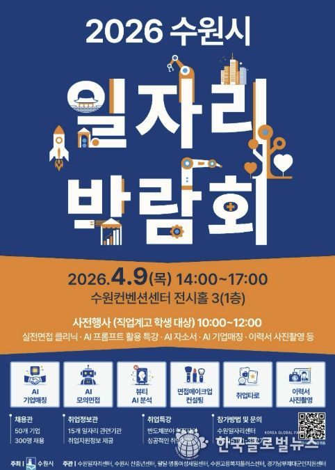 (한국글로벌뉴스 - 박소연 기자) 수원특례시는 9일 오후 2시부터 5시까지 수원컨벤션센터 전시홀에서 ‘2026 수원시 일자리박람회’를 개최한다.