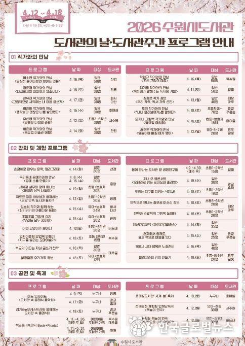 (한국글로벌뉴스 - 박소연 기자) 수원시도서관이 제62회 도서관주간(4월 12~18일)을 맞아 ‘도서관 속 작은 펼침, 세상을 여는 큰 열림’을 주제로 다양한 독서문화 프로그램을 운영한다.