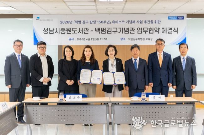 (한국글로벌뉴스 - 박소연 기자) 성남도시개발공사 중원도서관은 2026년 유네스코 기념해로 지정된 ‘김구 탄생 150주년’을 맞아 백범김구기념관과 업무협약을 체결했다고 6일 밝혔다.