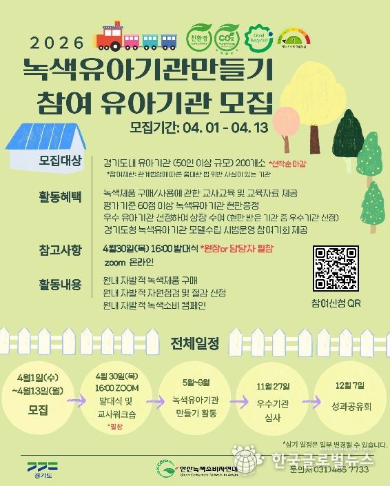 (한국글로벌뉴스 - 박소연 기자) 경기도가 아이들이 생활 속에서 올바른 녹색 소비 습관을 가질 수 있도록 돕는 ‘2026년 녹색유아기관만들기’ 참여 기관 200곳을 4월 13일까지 모집한다.