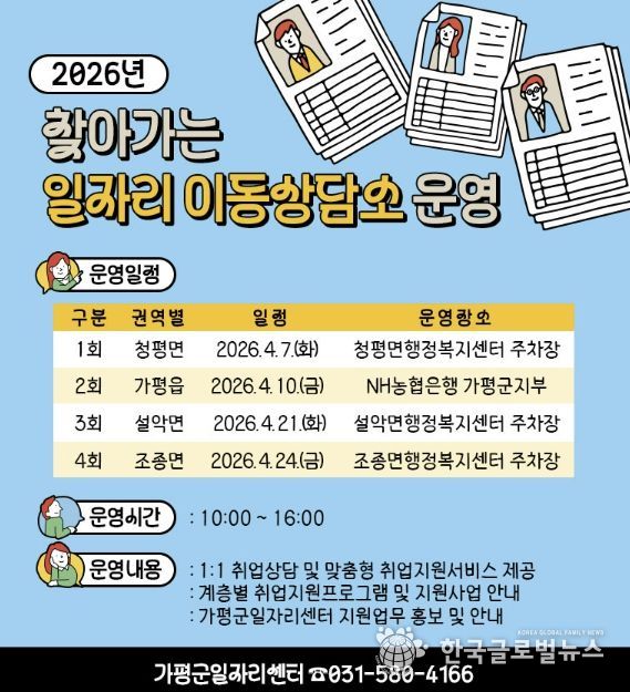 상반기 일정은 △4월 7일 청평면 행정복지센터를 시작으로 △10일 NH농협은행 가평군지부 △21일 설악면 행정복지센터 △24일 조종면 행정복지센터 등 관내 주요 거점을 순차적으로 방문할 예정이다. 일자리 이동상담소 운영 시간은 오전 10시부터 오후 4시까지다.