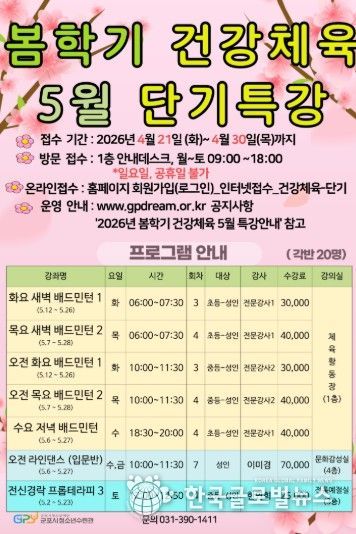 (한국글로벌뉴스 - 박소연 기자) (재)군포시청소년재단 군포시청소년수련관은 ‘2026년 봄학기 5월 단기특강 프로그램’을 운영하고 한다고 밝혔다.