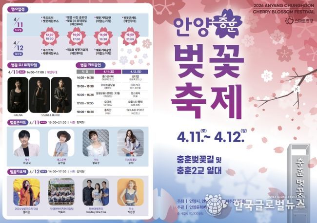 (한국글로벌뉴스 - 박소연 기자) 안양시는 오는 4월 11일부터 12일까지 이틀간 만안구 충훈동 충훈벚꽃길과 충훈2교 하부, 석수로 일대에서 ‘2026 안양충훈벚꽃축제’를 개최한다고 8일 밝혔다.