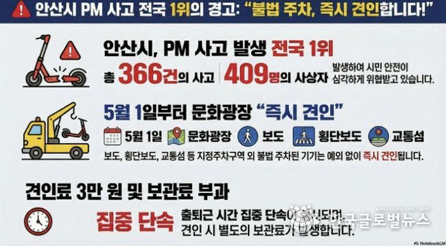 (한국글로벌뉴스 - 박소연 기자) 안산시는 개인형 이동장치(PM) 사고를 줄이고 보행자 안전을 확보하기 위해 불법 주정차 전동킥보드에 대한 ‘즉시 견인’을 시행한다고 10일 밝혔다.