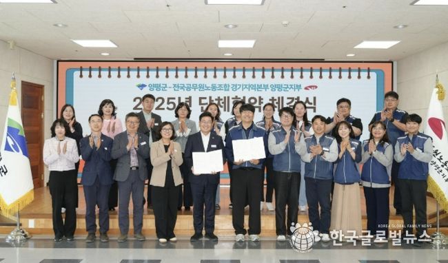 (한국글로벌뉴스 - 박소연 기자) 양평군은 지난 14일 군청 대회의실에서 전국공무원노동조합 경기지역본부 양평군지부와 ‘2025년도 단체협약 체결식’을 개최하고, 상호 신뢰를 바탕으로 한 협력적 노사관계 구축에 나섰다.