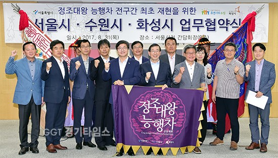수원·서울·화성시는 8월 31일 서울시청에서 ‘2017 정조대왕 능행차 공동재현 업무 협약’을 체결하고, 각 지역 자원을 최대한 공유·활용해 정조대왕 능행차를 우리나라를 대표하는 역사문화 축제로 발전시켜 나가기로 했다.
