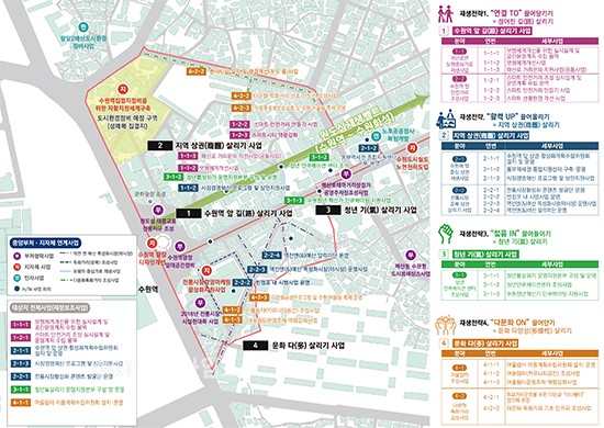 7개 분야는 ▲매산로 변 보행 중심가로(街路) 재생사업 ▲수원역 앞 안전거리 조성사업 ▲수원역 앞 중심상권 재생사업 ▲전통시장 골목상권 살리기 사업 ▲청년 인큐베이터센터 조성 사업 ▲다문화 특화 거리 조성사업 ▲어울림터 조성사업이다.