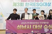 (한국글로벌뉴스 - 박소연 기자) 성남시는 ‘제3회 한국 이에스지(ESG) 대상’ 시상식에서 지방자치단체 이에스지(ESG) 부문 대상을 받았다고 11일 밝혔다. 한국 이에스지(ESG) 대상은 사단법인 한국ESG학회가 환경(Environmental), 사회(Social), 투명경영(Governance) 분야에서 탁월한 성과를 거둔 지자체 등 공공기관과 기업, 학교, 개인 등에게 주는 상이다. 성남시는 앞선 9월 ‘이에스지(ESG) 특별시 성남’ 비전을 선포한 이후 ‘환경과 사회’, ‘사회와 투명경영’ 등 분야 간 연계 효율을 높이는 융합형 이에스지(ESG) 접근법을 제시해 높은 평가를 받았다. 해당 사업으로 △기후테크 중소기업 육성(환경) △모든 시민 무료 독감 예방접종 지원(사회) △이에스지(ESG) 시민대학 프로그램 운영(투명경영) △맨발 황톳길 11곳 운영(환경+사회) △이에스지(ESG) 환경 분야 상생 협업 추진(환경+투명경영) △나눔 명예의 전당 운영(사회+투명경영) 등이 꼽힌다. 시 관계자는 “이번 수상은 성남시만의 이에스지(ESG) 특화사업을 추진하기 위해 모든 공직자가 함께 노력해 온