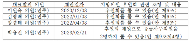 ○ 지방의원 상설후원회 설치 시 ‘정무보좌관’ 인력 도입 필요- 2022년 12월 헌법재판소 ‘헌법불합치’ 판결(법령 개정 시한 : 2024년 5월).- 보좌관 성격의 인력을 둘 수 있는 법안은 박용진 의원 발의안 1건임.※ 지방의원 상설후원회 설치 내용 포함된 정치자금법 일부개정법률안 현황