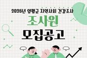 (한국글로벌뉴스 - 박소연 기자) 양평군은 질병관리청 및 양평군보건소와 공동으로 추진하는 ‘2026년 지역사회 건강조사’에 참여할 조사원 6명을 모집한다고 밝혔다. 지역사회 건강조사는 지역 주민의 건강 수준과 생활 습관, 만성질환 현황 등을 파악해 지역 특성에 맞는 보건 정책 수립의 기초 자료로 활용하기 위해 매년 실시되는 국가승인통계다. 이번 조사는 5월 16일부터 7월 31일까지 약 2개월 반 동안 진행되며, 조사 진행 상황에 따라 종료일은 변경될 수 있다. 모집 분야는 ‘2026년 지역사회 건강조사 조사원’으로, 근무 지역은 양평군 관내이며 모집 인원은 총 6명이다. 선발된 조사원은 조사 수행에 앞서 표본지점 확인을 위한 사전 조사를 실시하고, 조사 대상 가구로 선정된 표본가구를 직접 방문해 19세 이상 성인을 대상으로 스마트 기기(태블릿 PC)를 활용한 1대1 면접 조사를 수행하게 된다. 전형은 1차 서류 전형과 2차 면접 전형으로 진행된다. 군은 서류 전형에서 응시자의 자격 및 경력의 적합 여부를 심사하며, 1차 합격자를 대상으로 면접 전형을 실시한다. 원서 접수 기간은 3월 5일부터 13