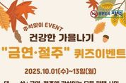(한국글로벌뉴스 - 박소연 기자) 평택시 송탄보건소에서 오는 10월 1일부터 13일까지 시민 누구나 참여할 수 있는 ‘건강한 가을나기 금연·절주 퀴즈 이벤트’를 진행한다. 이번 퀴즈 이벤트는 정보무늬(QR코드)를 활용 간편하게 참여할 수 있으며 금연·절주의 필요성과 건강관리 정보를 흥미로운 퀴즈 형식으로 접할 수 있도록 기획됐다. 퀴즈를 완료한 참여자 중 정답자 100명을 추첨해 금연 홍보물(보조배터리)을 증정하며 당첨자는 10월 15일 개별 문자로 안내된다. 상품은 10월 16일부터 22일까지 송탄보건소 1층 헬스케어상담센터 내 금연클리닉에서 수령할 수 있다. 송탄보건소 관계자는 “모든 시민이 금연과 절주의 필요성을 이해하고 건강한 생활을 실천하는 계기가 되길 바란다”라고 전했다.