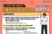(한국글로벌뉴스 - 박소연 기자) 광명시는 최근 인플루엔자 환자가 빠르게 증가함에 따라 시민들에게 예방접종과 개인예방수칙 준수를 재차 당부했다. 28일 시에 따르면 올해 44주차(10월 26일~11월 1일)부터 47주차(11월 16~21일) 인플루엔자 의사환자 분율(인플루엔자 의사환자 수/총 진료 환자 수)은 외래환자 1천 명당 ▲22.8명 ▲50.7명 ▲66.3명 ▲70.9명으로 4주 연속 크게 상승했다. 올해 유행 시기가 예년보다 앞당겨지면서 지난 10월 17일 인플루엔자 유행주의보 발령 이후 감염 위험이 빠르게 높아지고 있다. 시는 특히 ▲소아 ▲임신부 ▲65세 이상 어르신 ▲면역저하자 등 고위험군은 가까운 위탁의료기관에서 신속히 접종을 받을 것을 권고했다. 또한 감염 확산을 줄이기 위해서는 손 씻기와 마스크 착용 등 기본적인 예방수칙을 지키고, 발열·기침 등 의심 증상이 있을 경우 즉시 의료기관을 방문해 진료받는 것이 바람직하다. 박선미 감염병관리과장은 “올해 인플루엔자 유행이 평년보다 빨라 주의가 더욱 필요한 시기”라며 “특히 고위험군은 서둘러 예방접종을 받고, 개인위생 수칙을