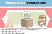(한국글로벌뉴스 - 박소연 기자) 안성시 중앙도서관은 오는 10월 29일부터 12월 24일까지 매주 수요일 오전 10시부터 12시까지(총9회) 진행되는 『옛이야기 할머니』양성과정의 수강생을 모집한다. 이번 과정은 우리 전통 설화와 구전문화를 이해하고, 이를 바탕으로 어린이들에게 옛이야기를 들려줄 수 있는 이야기 구연 역량을 키우는 특화 교육 프로그램으로 교육은 송경애 강사(한국국학진흥원 및 아름다운 이야기 할머니 교육강사)가 진행하며, 이야기 전달 기법, 발성 훈련, 스토리텔링 실습 등 실질적인 교육 중심으로 구성된다. 참여 대상은 60세 이상 여성 20명으로, 접수는 10월 14일부터 도서관 홈페이지, 전화 또는 방문을 통해 신청할 수 있다. 도서관 관계자는 “지역 어르신들이 삶의 지혜와 전통 이야기를 전하며 세대 간 소통의 다리를 놓는 뜻깊은 과정이 될 것이고 본 과정을 수료한 참여자들은 2026년 ‘책 읽어주기’ 자원봉사 프로그램에 참여할 수 있도록 안내할 계획이다.”라고 전했다.