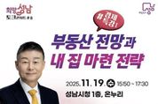 (한국글로벌뉴스 - 박소연 기자) 성남시는 오는 11월 19일 오후 3시 50분~5시 30분 시청 1층 온누리에서 ‘부동산 전망과 내 집 마련 전략’을 주제로 한 희망성남 토크콘서트 8강을 연다. 이번 초빙 강사는 고종완 한국자산관리연구원장이다. 고종완 원장은 변화하는 부동산시장 속에서 시민들이 알아야 할 부동산 정책, 향후 시장 전망, 내 집 마련 전략 등에 관해 강연한다. 고 원장은 한양대학교 도시공학박사로 건국대학교 부동산대학원 초빙교수, 한양대학교 부동산융합대학원 특임교수, LH자문위원 등을 역임했다. 현재 국민연금공단 대체투자위원회 위원, 금융위원회 금융발전심의회 위원 등으로 활동하고 있다. 저서로 ‘살 집 팔 집’, ‘대한민국 부동산 전쟁’ 등이 있다. 강연은 무료로 진행되며, 성남시 평생학습 통합 플랫폼 ‘배움숲’ 홈페이지를 통해 선착순 600명까지 신청할 수 있다. 성남시는 경제 특강 2탄으로 오는 12월 9일 김광석 한국경제산업연구원 경제연구실장을 초빙해 희망성남 토크콘서트 올해 마지막 강연(9강)을 연다.