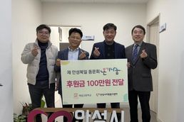(한국글로벌뉴스 - 박소연 기자) 지난 8일, 안성시자원봉사센터는 연말을 맞아 재 안성북일 동문회로부터 온기나눔 후원금 100만 원을 전달받았다. 이날 안성시자원봉사센터에서 진행된 후원금 전달식은 동문회가 지역사회에 따뜻한 연말 온정을 나누고 복지 사각지대에 놓인 이웃들을 돕기 위해 마련됐으며, 동문들은 십시일반 후원금을 모아 따뜻한 마음을 전했다. 전달된 후원금은 동문회의 뜻에 따라 식료품을 구입하여 관내 복지 소외계층에게 전달될 예정이다. 김동성 센터장은 ‘연말 따뜻한 나눔을 실천해 주신 재 안성북일 동문회에 깊이 감사드린다’라며, ‘동문회의 소중한 마음이 이웃들에게 잘 전달되어 따뜻한 겨울을 나는 데 도움이 되도록 하겠다’라고 말했다. 안성북일 윤기현 동문회장(용인 고림중학교장)은 ‘지역사회 동문들의 정성을 모아 이웃을 도울 수 있어 기쁘다’라며, ‘작은 나눔이지만 어려운 이웃들에게 온기를 전하는 불씨가 되기를 바란다’라고 화답했다. 또한 김관섭 고문(미양농협조합장)은 “동문회의 따뜻한 온기가 더 널리 퍼져 안성시 전체가 행복해지기를 응원한다”라고 격려했다. 한편, 안성시자원봉사센