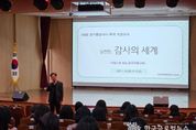 (한국글로벌뉴스 - 박소연 기자) 경기도수원교육지원청은 12월 3일 관내 학교와 소속 직원을 대상으로 ‘감사(監査)했습니다–폭삭 속았수다’ 공연연계형 감사사례교육을 운영했다. 이번 교육은 지난해에 이어 2년 연속 수원시립예술단의 찾아가는 예술무대와 협력해, 한 해 동안 감사와 업무에 힘쓴 교직원과 직원을 격려하고자 마련됐다. 교육은 수원시립공연단의 감성콘서트, 학교종합감사 사례 나눔, 공무원 범죄 통보사례 안내, 복무감사 주요 사례 소개 등으로 구성됐다. 부대행사로는 포토존·청렴존·메모리존을 운영해 참여형 교육의 폭을 넓혔다. 특히 포토존에서는 학창시절을 드레스코드로 교복 소품을 활용해 추억을 나눴고, 청렴존에서는 다트게임과 ‘내 마음 속 갑질 1위?’ 활동을 통해 다양한 목소리를 듣고 청렴의식을 환기했다. 메모리존에서는 ‘2026년 다 이루어질지니’를 주제로 새해 목표와 다짐을 작성하는 시간을 마련했다. 수원교육지원청 김선경 교육장은 “이번 교육은 전통적인 방식에서 벗어나 소통과 공감을 바탕으로 한 감사사례교육”이라며 “감사와 청렴을 다양한 형태로 녹여 교육 효과를 높이고, 앞으로도 학교현장에 도움이 되는 예