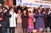 (한국글로벌뉴스 - 박소연 기자) 이재준 수원특례시장은 1일 아침 팔달산 서장대에서 시민들과 함께 해맞이를 하고, “시민 여러분께서 소망하시는 모든 것을 성취하시길 기원하겠다”고 말했다. 이재준 시장은 “올해도 시민 여러분과 함께 수원을 더 새롭고, 더 빛나게 만들기 위해 노력하겠다”며 “모든 시민이 수많은 역사와 희망을 만드는 멋진 한 해가 되길 바란다”고 기원했다. 서장대 일원을 가득 메운 시민들은 떠오르는 해를 보며 함께 소원을 빌었다. 수원시는 12월 31일 저녁부터 1월 1일 아침까지 일원에서 시민들과 함께하는 송년·신년 행사를 열었다. 12월 31일 밤 10시 30분부터 행궁광장 특설무대에서 ‘제야음악회’가 열렸다. 자정에는 여민각에서 제야 타종 행사를 열고 2026년 병오년(丙午年)의 시작을 알렸다. 이재준 시장, 이재식 수원특례시의회 의장, 김영진(수원시병)·김준혁(수원시정) 의원, 시민 대표 등이 타종했다. 이재준 수원시장과 김현수 제1부시장, 4개 구청장, 실·국장 등은 1일 오전 9시 현충탑을 참배했다.