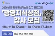 (한국글로벌뉴스 - 박소연 기자) 광명시 평생학습원이 시민 맞춤형 평생학습 프로그램 ‘광명지식상점’을 운영할 2026년도 전문 교육 강사를 공개 모집한다. ‘광명지식상점’은 시민의 삶과 밀접한 주제를 중심으로 배움과 성장을 지원하는 광명시 대표 평생학습 프로그램이다. 2026년에는 ▲미래기술 ▲직무역량 ▲재무설계 ▲인문성찰 ▲관계학습 ▲시민학습 ▲기타 제안과정 등 7개 분야에서 강사를 선발해 시민들에게 다채로운 교육 서비스를 제공할 예정이다. 지원 자격은 해당 모집 분야의 전문성을 보유하고 관련 자격증과 실무경력을 모두 갖춘 자에 한한다. 시는 강의 경력, 강의계획서, 자기소개서 등을 바탕으로 1차 서류심사를 진행한 뒤, 수업 시연과 질의응답으로 구성된 2차 면접심사를 거쳐 최종 40여 명의 강사를 선발할 계획이다. 접수는 오는 12일부터 19일 17시까지 이메일 또는 평생학습원 2층 사무실 방문을 통해 가능하다. 제출 서류 등 세부 사항은 광명시 평생학습플랫폼 ‘광명이(e)지’ 공지사항에서 확인할 수 있다. 최종 합격자는 2월 중 ‘광명e지’에서 발표하며, 선발된 강사진은 3월부터 본