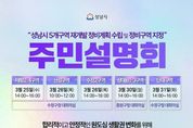 (한국글로벌뉴스 - 박소연 기자) 성남시는 수정·중원 생활권 재개발 후보지로 선정된 5개 구역의 정비계획 수립 및 정비구역 지정(안)과 관련해 주민 의견을 수렴하고자 오는 3월 25일부터 31일까지 주민설명회를 개최한다. 이번 설명회는 수진2구역, 태평2‧4구역, 산성구역, 단대구역, 상대원1‧3구역을 대상으로 하며, 구역별 정비계획 수립(안)과 향후 추진 절차를 안내하고 주민 의견을 폭넓게 듣기 위해 마련됐다. 설명회 일정은 △3월 25일 오후 2시 태평2‧4구역(수정구청 대회의실)을 시작으로 △3월 26일 오전 10시 산성구역, 같은 날 오후 2시 수진2구역(수정구청 대회의실) △3월 30일 오후 2시 상대원1‧3구역(중원구청 대회의실) △3월 31일 오후 2시 단대구역(수정구청 대회의실) 순으로 진행된다. 설명회에는 해당 구역 토지등소유자와 세입자를 비롯해 재개발 사업에 관심 있는 주민이면 누구나 참여할 수 있다. 시는 지난해 12월 사전 주민설명회를 통해 수렴한 의견을 이번 정비계획(안)에 반영했으며, 이번 설명회를 통해 추가 의견을 폭넓게 수렴할 계획이다. 아울러 주민설명회 이